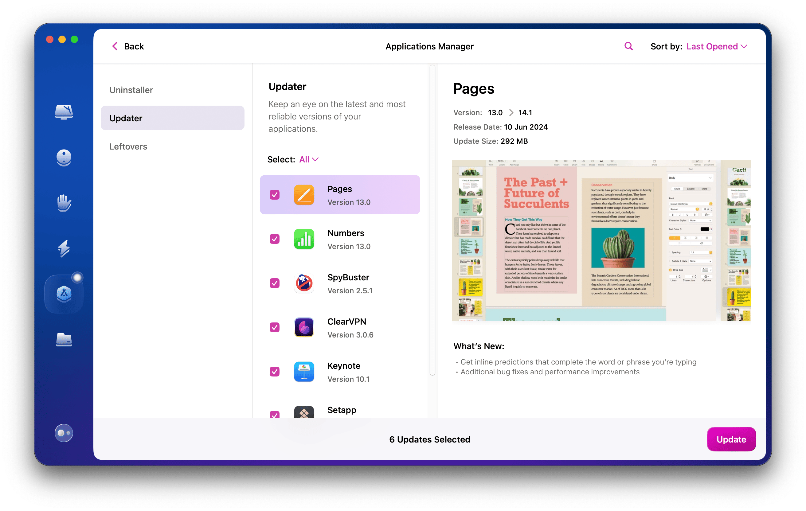 相反,請使用應用程序功能清理我的Mac。除了在一個簡單的地方批量更新所有應用程序(包括非 App Store 的應用程序)之外,您實際上還可以在這裡執行更多操作,包括: