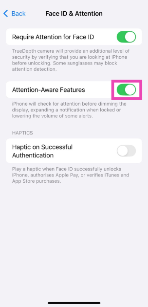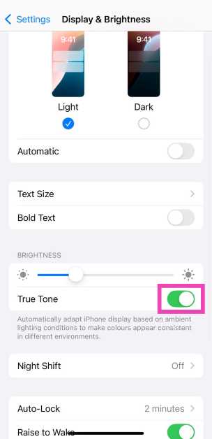 去設置>可訪問性>顯示和文本大小並關閉自動亮度旁邊的撥動開關。關閉“面對ID注意”和“可訪問性”頁面上的注意設置。最後,從顯示設置中關閉真實的音調和夜視。