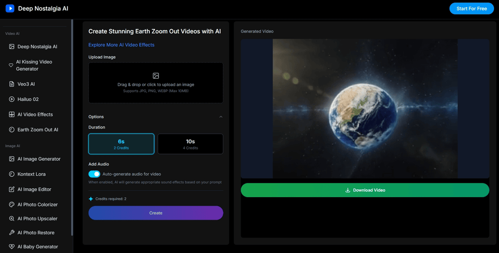 EarthZoomOutAI.com是一款專門用於創建縮小地球視頻的在線工具。您可以選擇不同的相機運動,並選擇適合您需求的不同縱橫比。