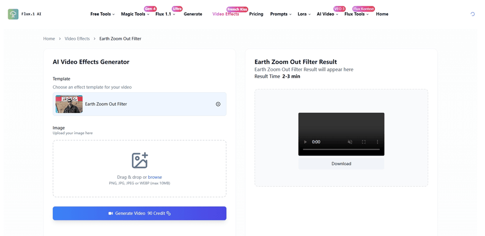 Flow.1 人工智能將任何照片轉換為流暢的縮小視頻,最後呈現地球的全景 - 並且以令人驚嘆的 4K 畫質實現。然而,它使用基於信用的定價系統。您需要購買積分才能在 Flux AI 上使用地球縮小效果。