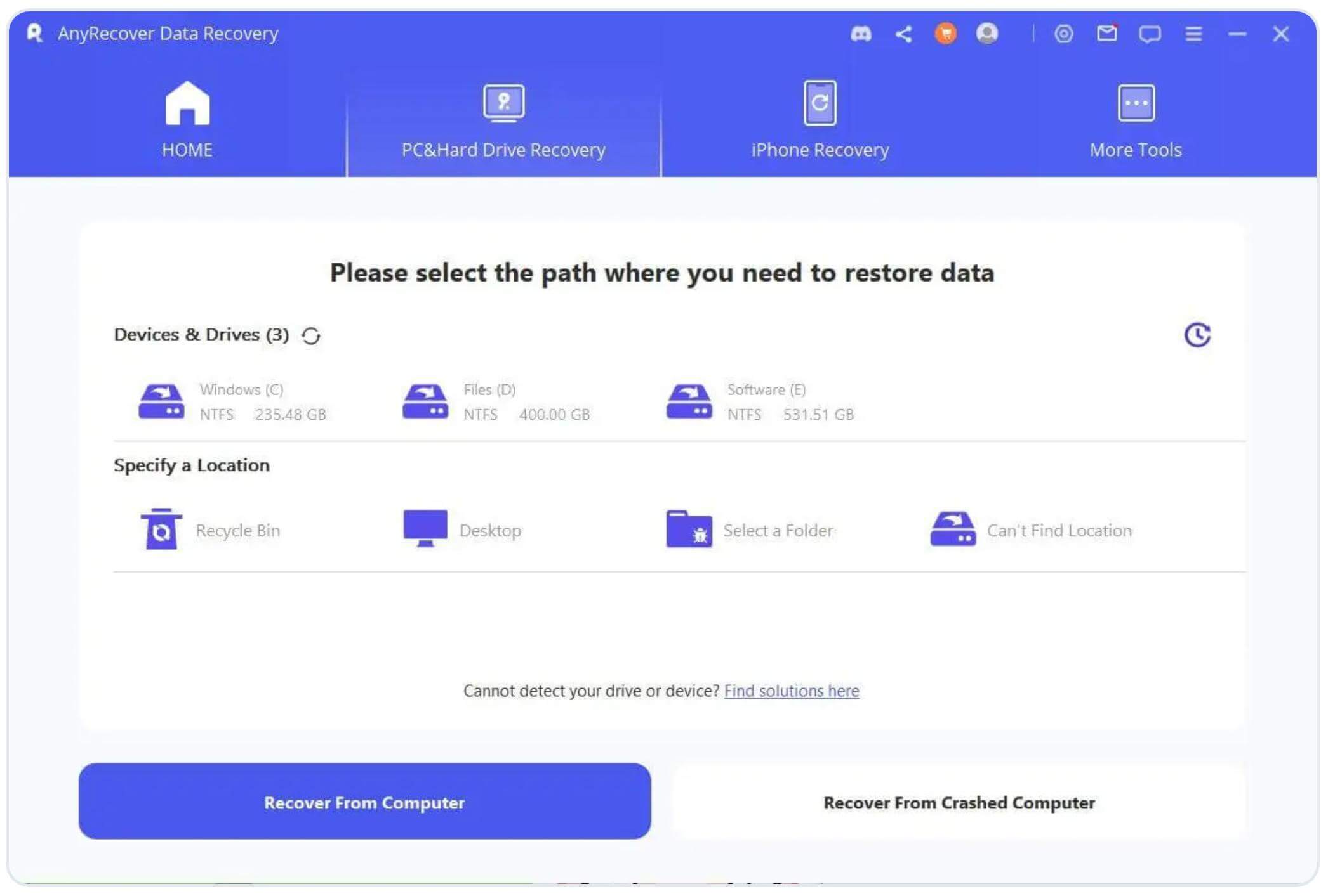 步驟2。打開AnyRecover。單擊電腦和硬盤恢復。您將看到所有磁盤和驅動器。選擇丟失數據的位置。您還可以選擇特定文件夾。