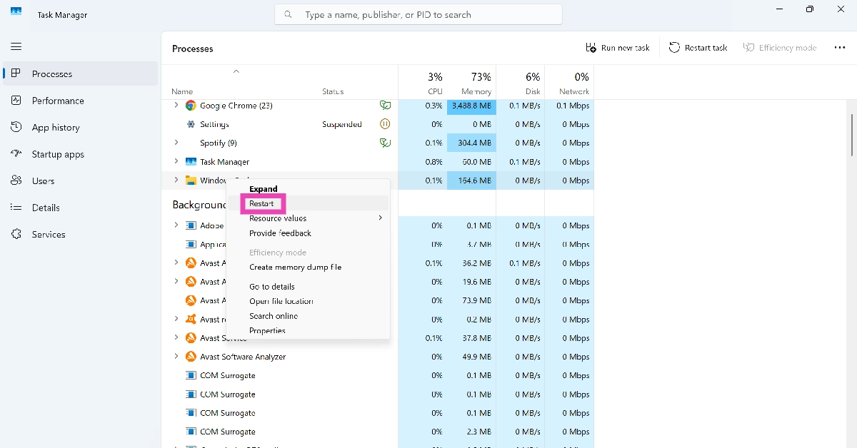 步驟3:右鍵單擊Windows資源管理器並選擇重新啟動。