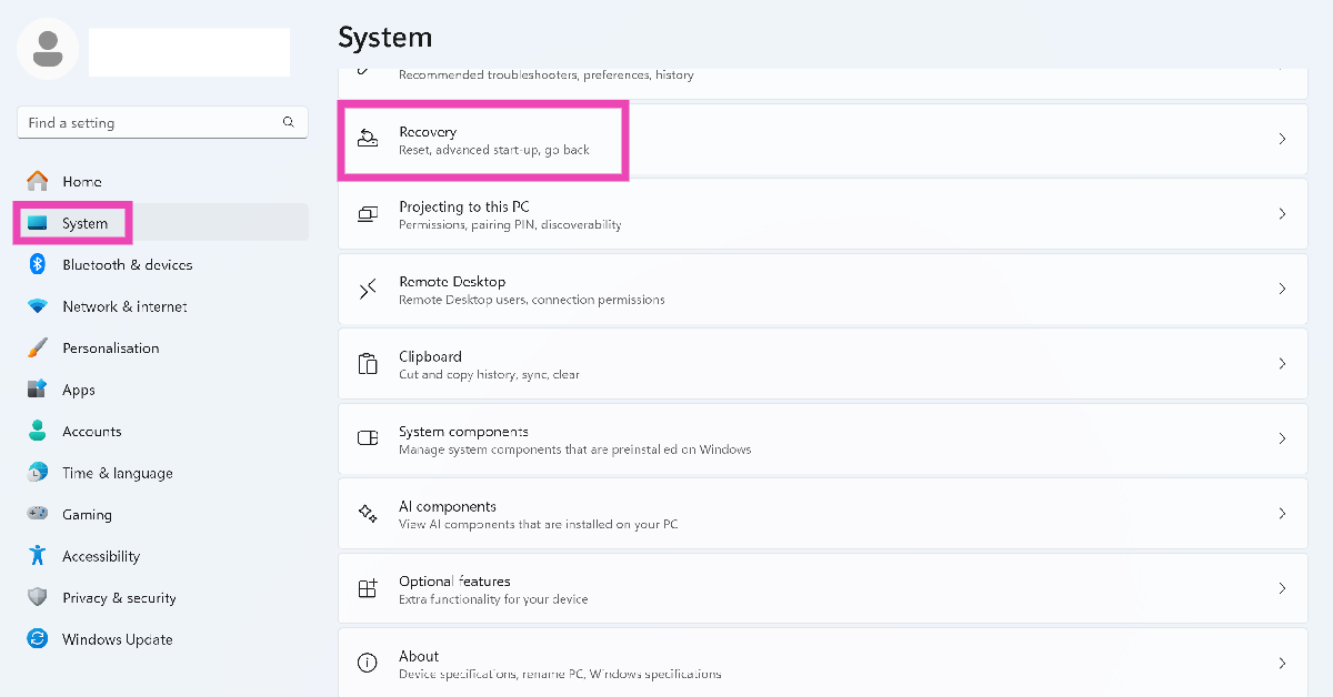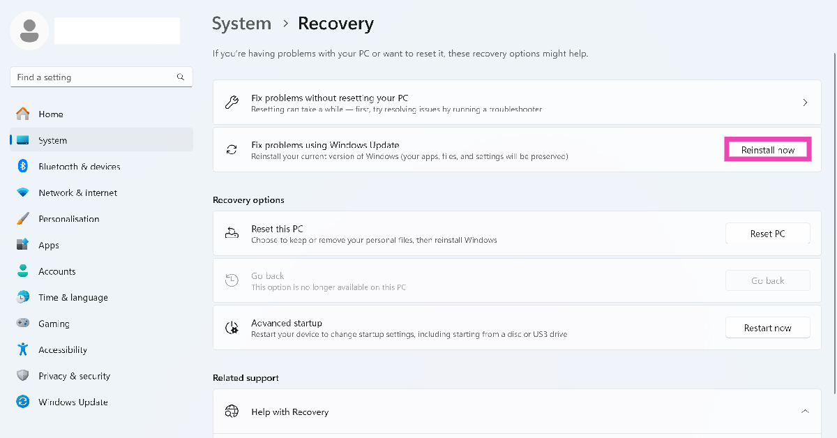 前往設置>系統>恢復然後單擊“使用 Windows 更新修復問題”旁邊的“立即重新安裝”。