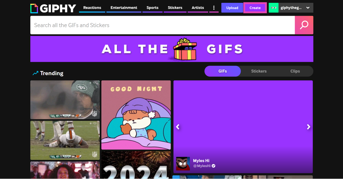 步驟一:在您的 PC 上啟動網絡瀏覽器並轉至https://giphy.com/。登錄您的帳戶。如果您沒有帳戶,請創建一個帳戶。