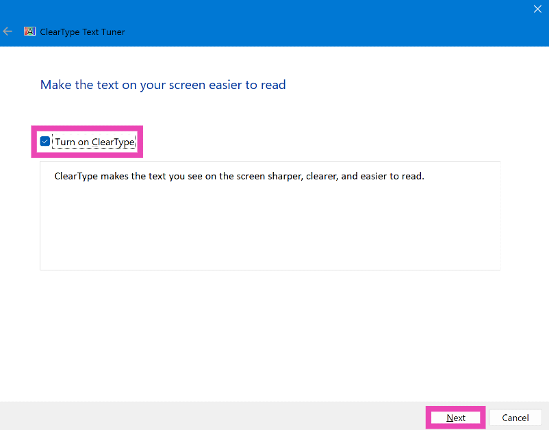 第5步:點擊旁邊的複選框打開 ClearType然後單擊下一個。