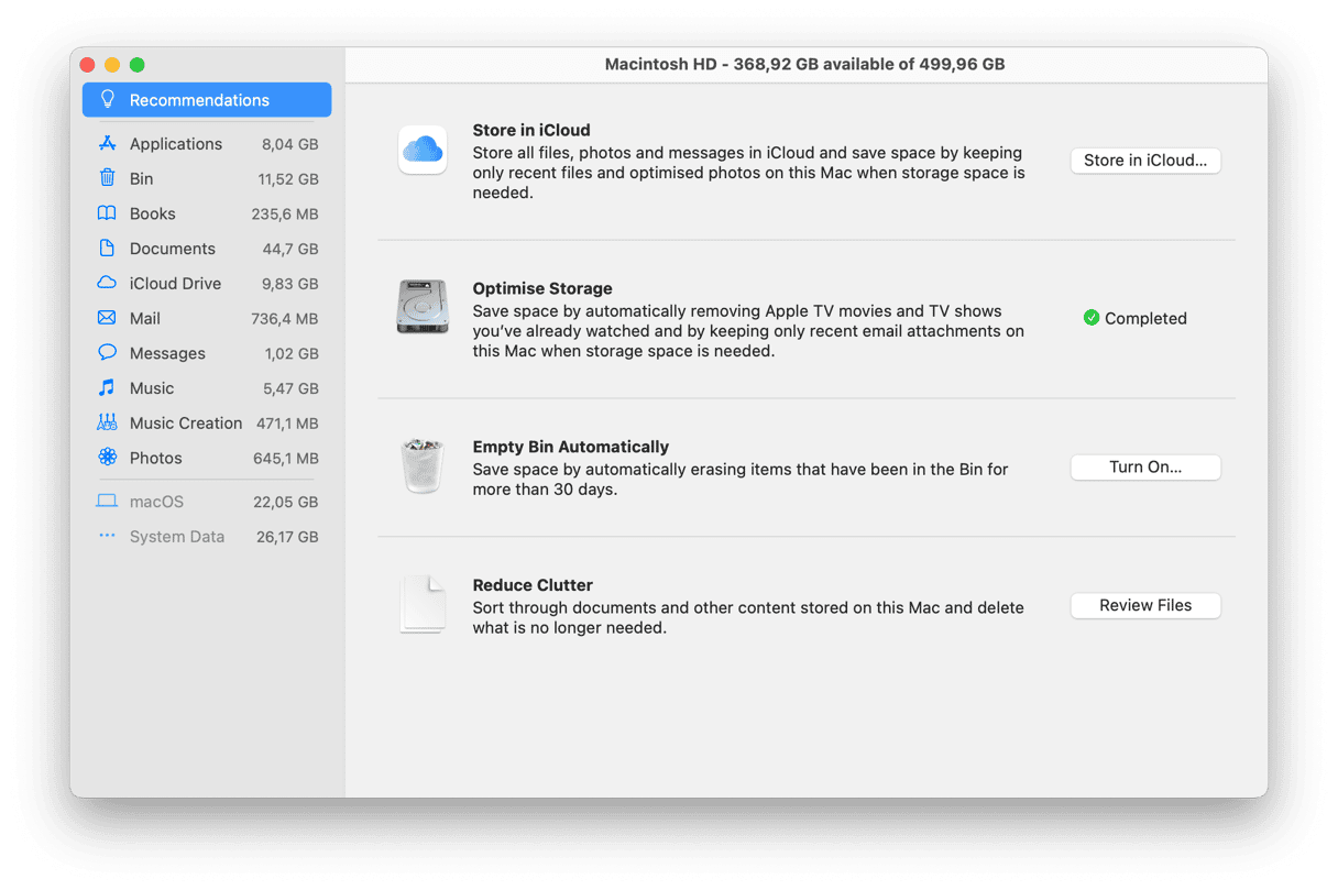 轉到 Apple 菜單並選擇“關於本機”>“更多信息”。選擇存儲設置。在出現的窗口中,您可以看到一些有用的建議。 “存儲在 iCloud 中”可讓您將所有數據傳輸到雲存儲並回收 Mac 上的一些 GB。第二個選項允許您刪除最重的文件,例如電影和應用程序。