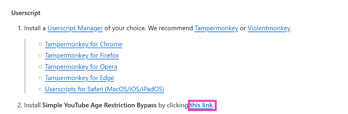 步驟2:前往簡單的 YouTube 年齡限制繞過頁面在 GitHub 上並向下滾動到用戶腳本部分。