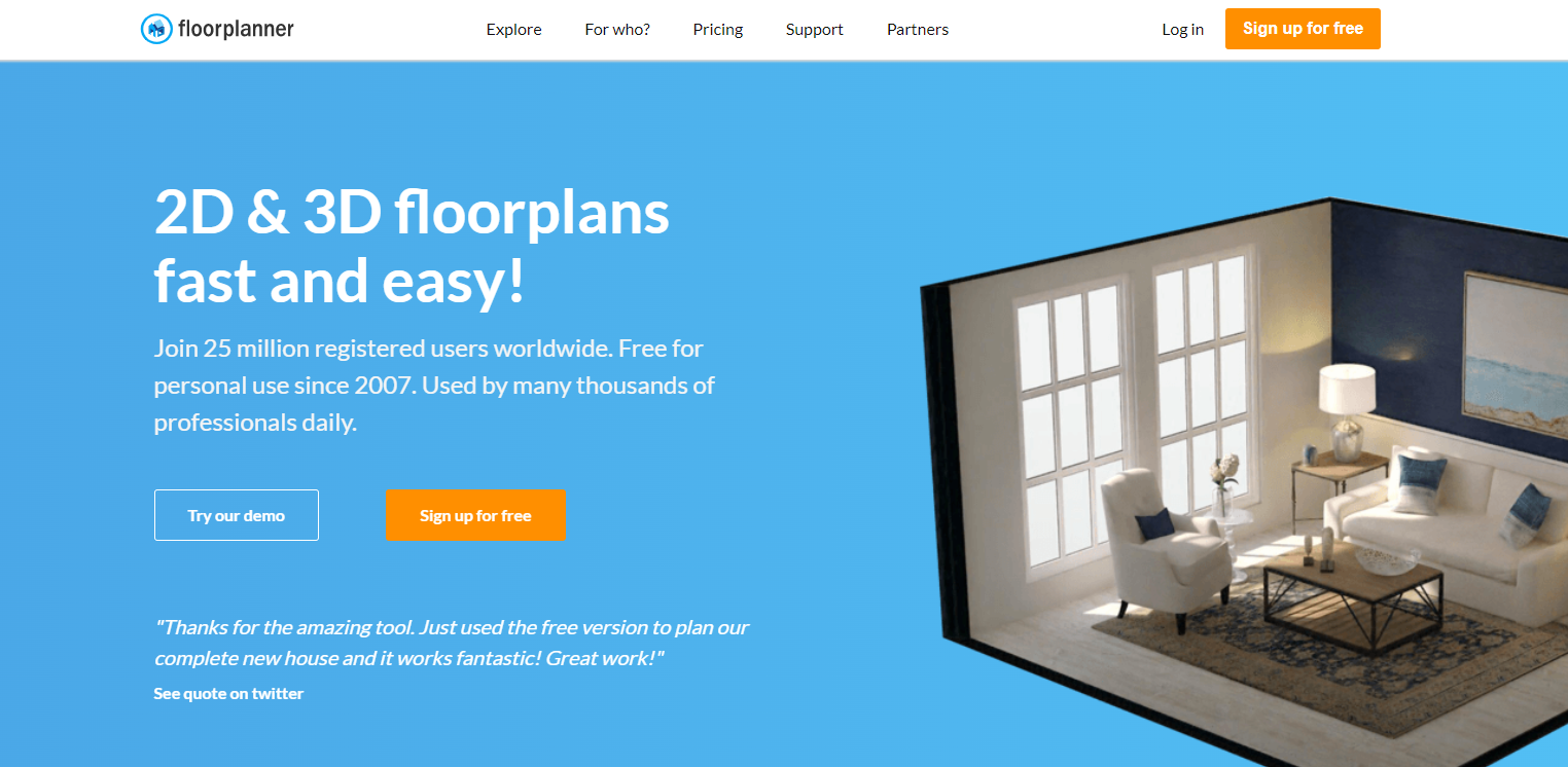 FloorPlanner 是一款免費的建築設計軟件,可讓您創建 2D 和 3D 平面圖,然後在線共享這些平面圖的交互式版本。它具有“自動整理”功能,可以輕鬆地按照計劃裝飾房間。規劃師完成的平面圖顯得專業而精緻,可供展示。