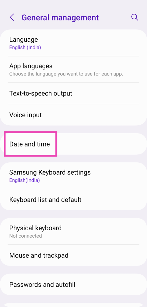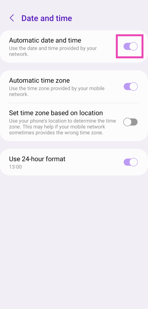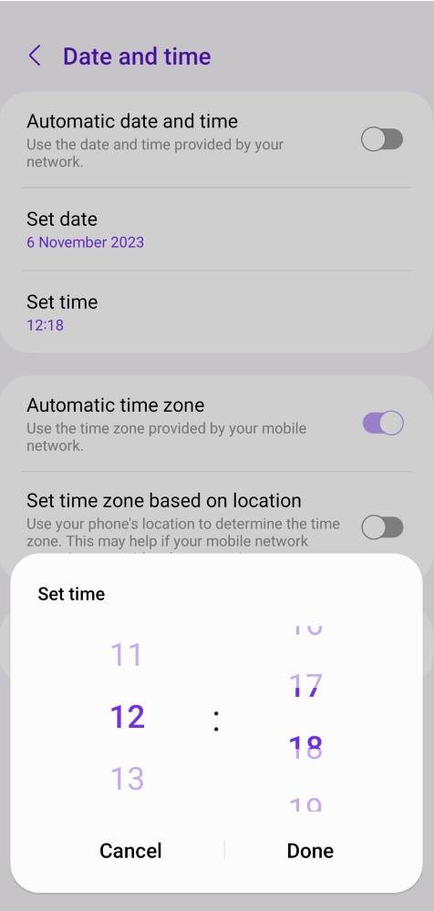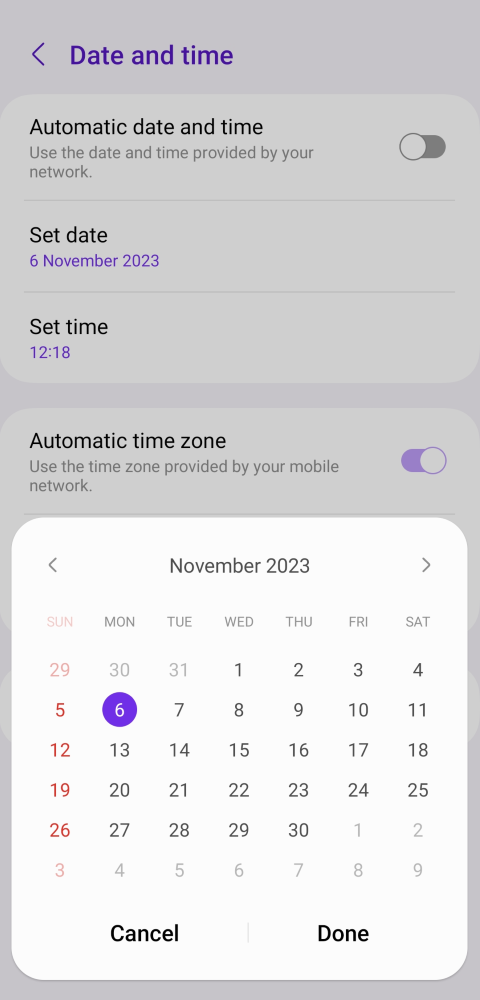 您的智能手機會使用設備上最近的手機信號塔和 GPS 服務自動設置日期和時間。如果您想在設備上手動設置日期和時間,請轉至設置>常規管理>日期和時間並關閉自動日期和時間的切換開關。