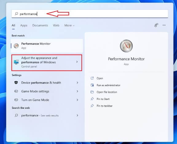 步驟1。導航到任務欄上的搜索框並輸入性能按鈕。從您收到的結果中選擇“調整 Windows 上的外觀和性能”圖標。
