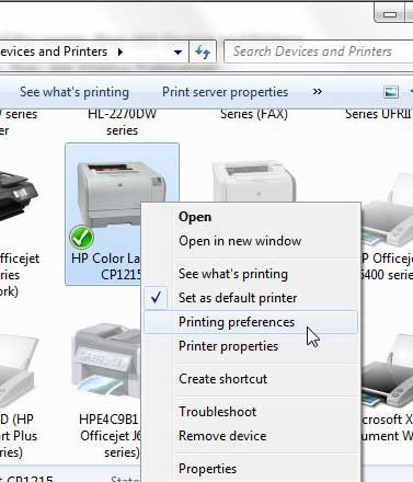 步驟 2:右鍵單擊惠普彩色激光打印機 CP1215圖標,然後單擊打印首選項。