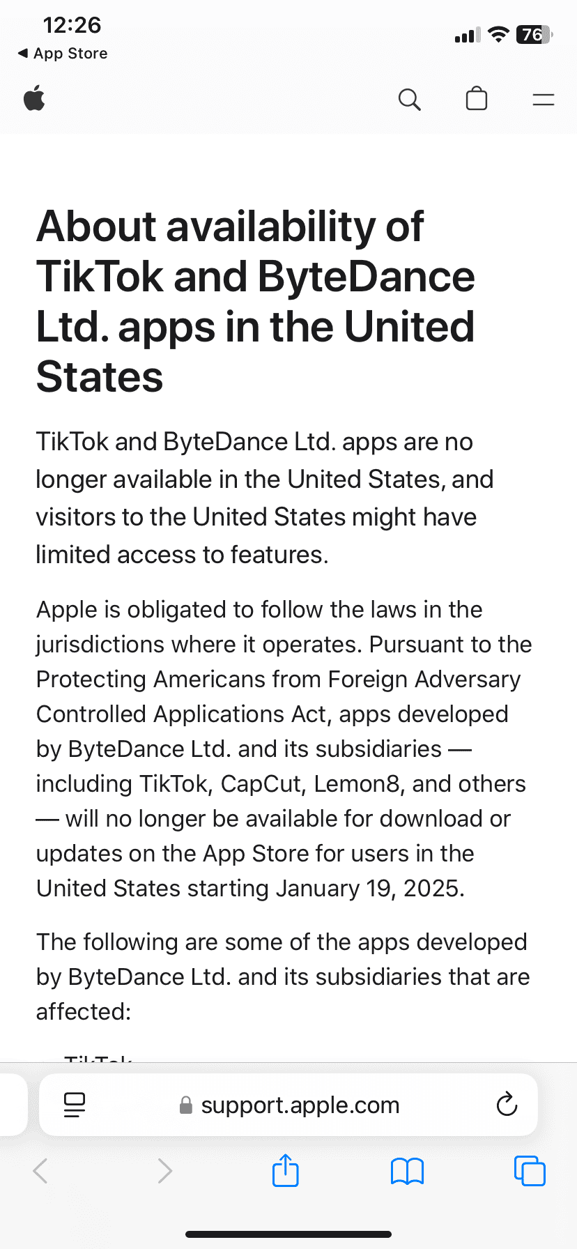 由於對其中國所有權相關的國家安全風險的持續擔憂,該應用程序仍然無法下載。 TikTok 的網站和現有安裝似乎對某些用戶有效,但新的下載被阻止。這種情況導致潛在的新用戶無法通過官方渠道訪問該平台。