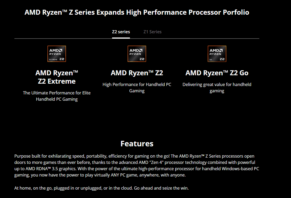 - 銳龍 Z2 Go:更節能的型號,具有 4 核/8 線程,使用 AMD RDNA™ 2 頻率提升至 4.3 GHz。