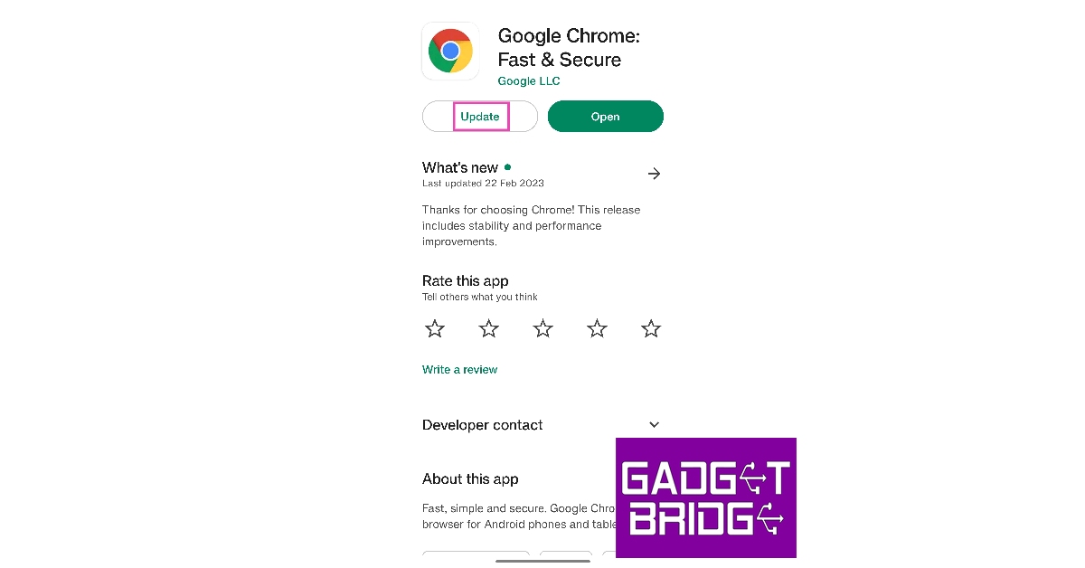 第4步:您將被重定向到應用程序的頁面。點擊“更新”將 Chrome 更新到最新版本。