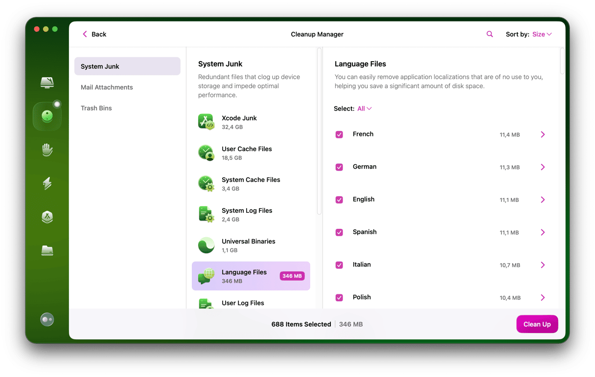 有一種簡單的方法和一種手動方法。最簡單的方法是獲取像 CleanMyMac 這樣的臃腫軟件刪除程序,它可以找到並將它們與 Mac 上可能存在的其他系統垃圾一起刪除。只需下載 CleanMyMac 的免費版本,單擊“清理”選項卡,然後運行掃描即可。然後,在掃描結果中,檢查語言文件並點擊“清理”。