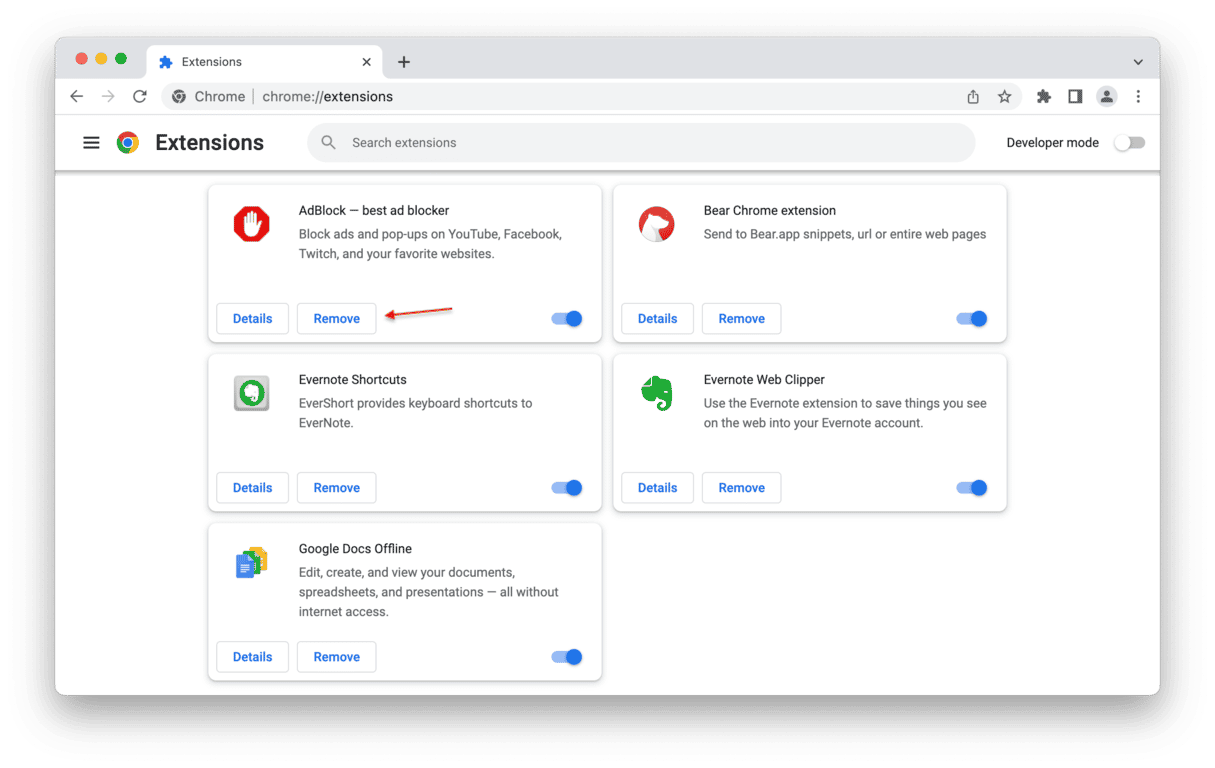 chrome://extensions並按回車鍵。 - 您將看到所有 Chrome 擴展程序的列表。
