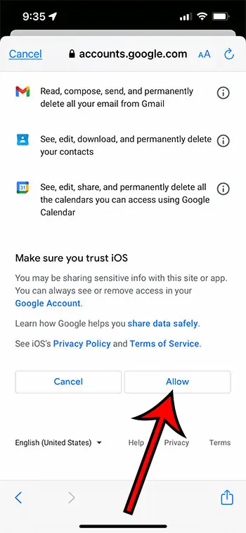 步驟 7:點擊允許以確認您想讓 iOS 訪問您的帳戶。