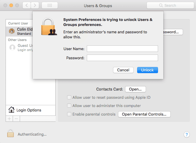 - 單擊鎖定圖標並輸入您的管理員名稱和密碼。