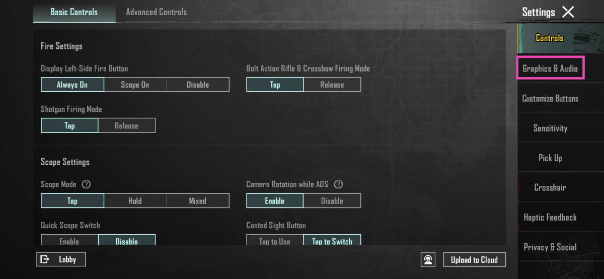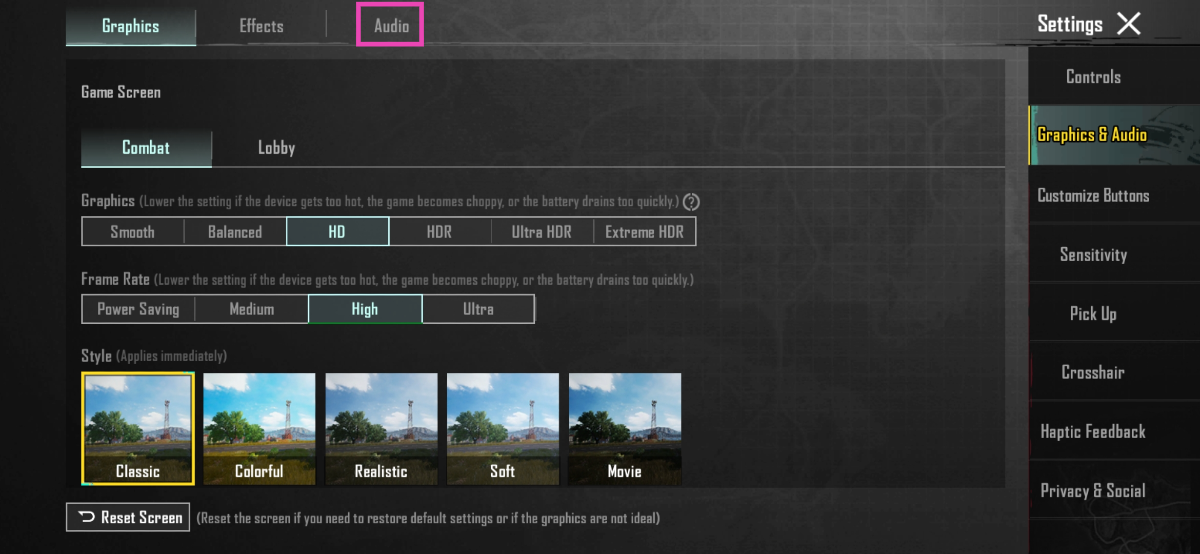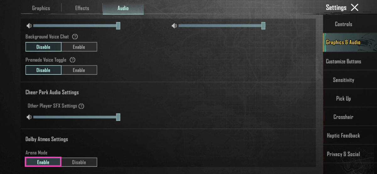 在 Android 手機上啟動 BGMI,加入比賽,點擊齒輪圖標進行設置,點擊“圖形和音頻”,切換到“音頻”選項卡,然後點擊杜比全景聲下的“啟用”。