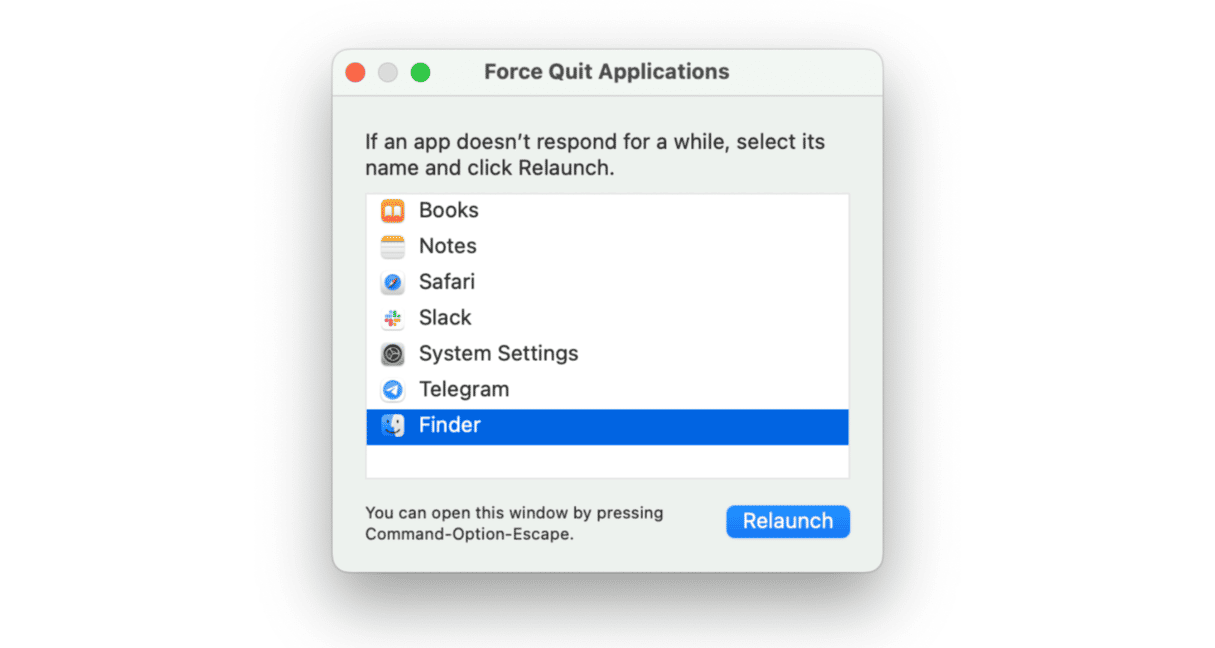 有時,Finder 可能會遇到問題,並使問題看起來像是出現了更嚴重的問題。您可以重新啟動 Finder 來修復它。有幾種方法可以做到這一點: