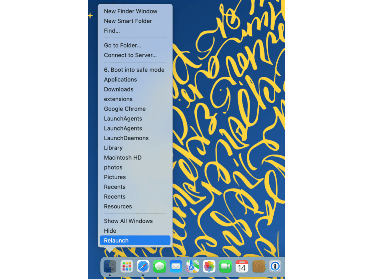 - Dock:按住 Option,右鍵單擊 Finder 圖標,然後選擇重新啟動。