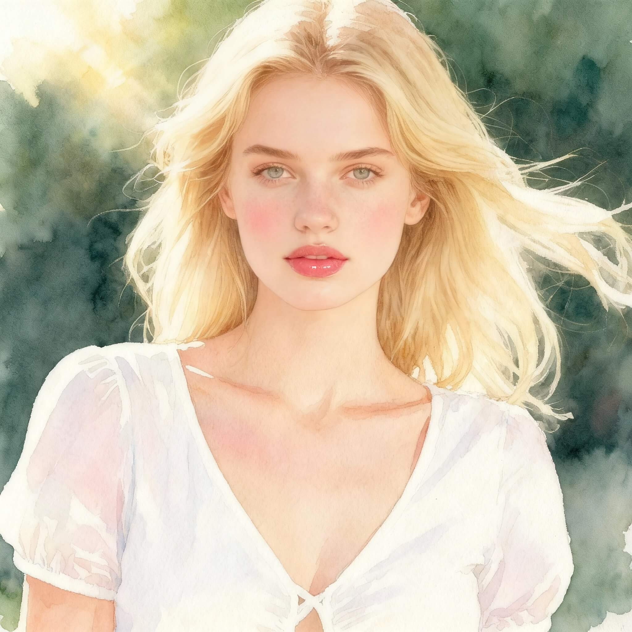 提示1:使用上傳的照片來增強肖像,自然的粉紅色妝容,柔和的腮紅和光澤的嘴唇,以水彩畫風格渲染,伴隨著早晨柔和的陽光。