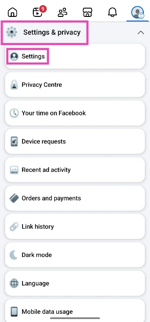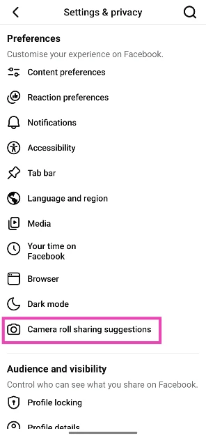 在手機上啟動 Facebook 應用程序,點擊菜單圖標,然後轉到設置和隱私>設置>相機膠卷共享建議並關閉“瀏覽 Facebook 時獲取相機膠卷建議”旁邊的切換開關。