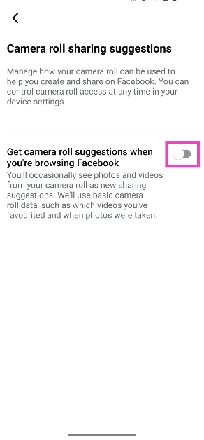 第5步:關閉旁邊的切換開關當您瀏覽 Facebook 時獲取相機膠卷建議。如果您看到一個選項雲處理,也將其關閉。