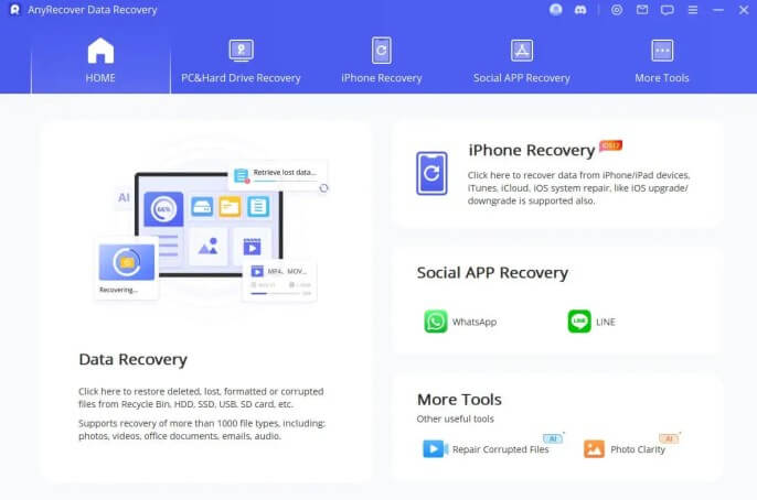 除了允許您恢復 1000 多種數據類型外,AnyRecover 還支持幾乎所有存儲設備,並提供簡單的用戶界面。