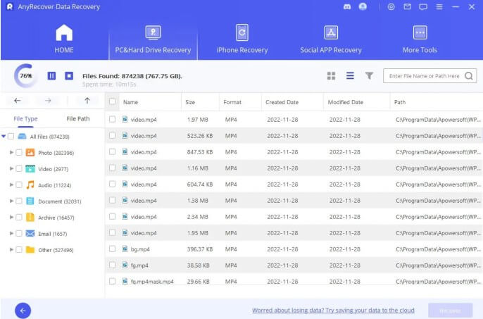 步驟2:點擊“掃描”圖標開始掃描丟失的數據,AnyRecover 將掃描丟失的數據。