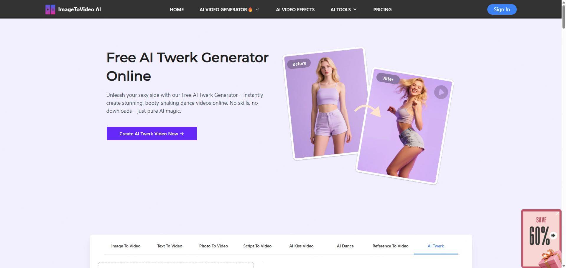 對於尋求真正的用戶免費的 ai twerk 視頻生成器,圖像到視頻人工智能提供無水印的無限高清視頻導出。它針對移動使用進行了優化,並且不需要註冊。