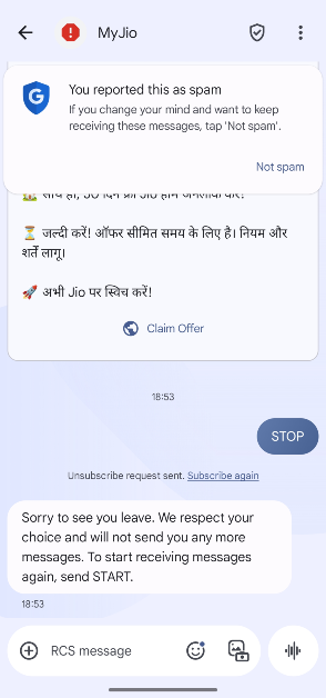 當您向品牌或服務提供您的號碼時,他們會將您放在短信列表中,以通知您最新的方案和優惠。雖然這在某些情況下很有用,但每天多次持續發出警報只不過是垃圾郵件。當您取消訂閱某項服務時,Google Messages 會自動發送“停止”消息,提醒其將您從短信列表中刪除。當然,某些發件人可能會忽略此請求並推送垃圾郵件。在這種情況下,最好也報告它們。