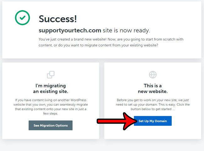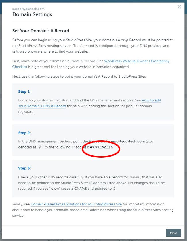 如果您要遷移現有站點,那麼您將有幾個選擇,但我將在下面重點介紹如何設置新站點。單擊後設置我的域單擊上圖中的按鈕,您將看到一個屏幕,其中提供了有關正確配置 A 記錄所需執行的操作的信息。