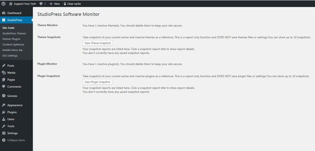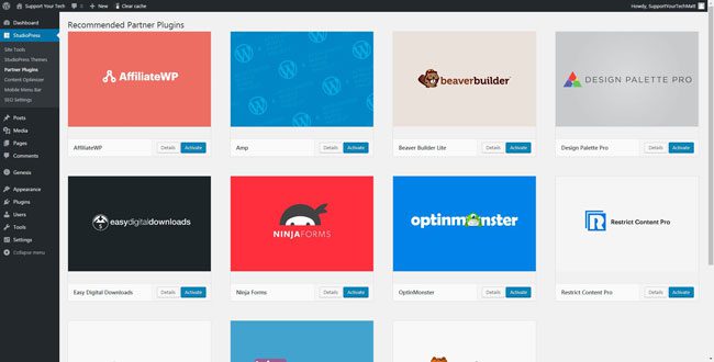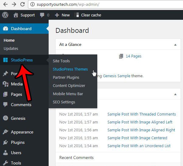 然後您就進入了正常的 WordPress 管理部分,因此如果您以前使用過 WordPress,那麼這看起來會非常熟悉。然而,最大的變化是在窗口左側欄中的 StudioPress 鏈接上。