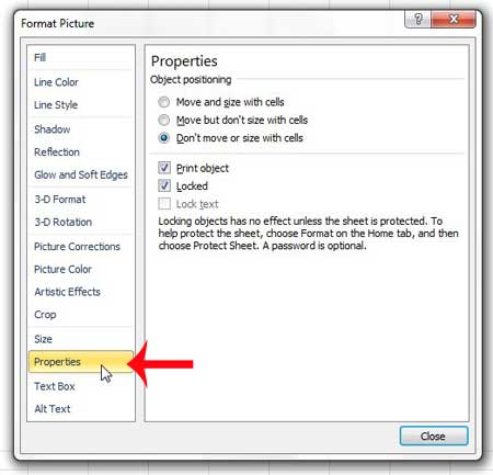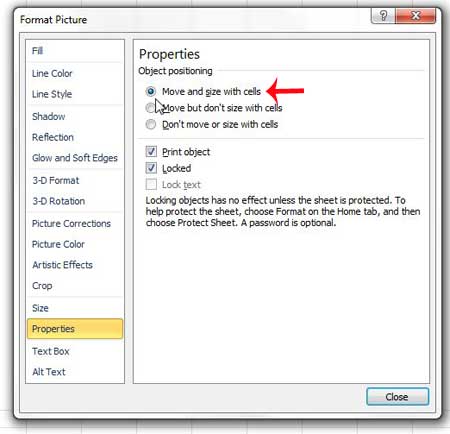 第 4 步:單擊使用單元格移動和調整大小下的選項物體定位靠近頂部的設置圖片格式窗戶。單擊關閉按鈕位於窗口底部以應用更改並關閉窗口。
