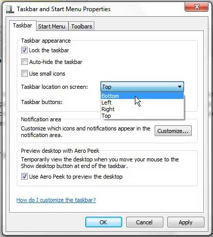 - 單擊右側的下拉菜單任務欄在屏幕上的位置,然後選擇底部選項。