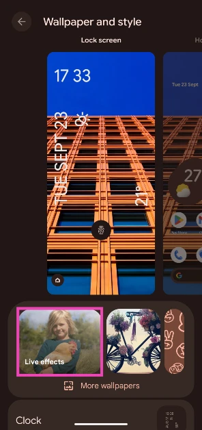 用戶可以獨享其壁紙的“3D 動態效果”。此功能在運行原生 Android 操作系統的其他智能手機上不可用。您可以在“壁紙和样式”設置的“實時效果”部分中找到它。一旦將 3D 動態效果應用到壁紙上,每次屏幕激活時都會使主題栩栩如生。圖像的背景出現輕微的移動,帶來動態效果。