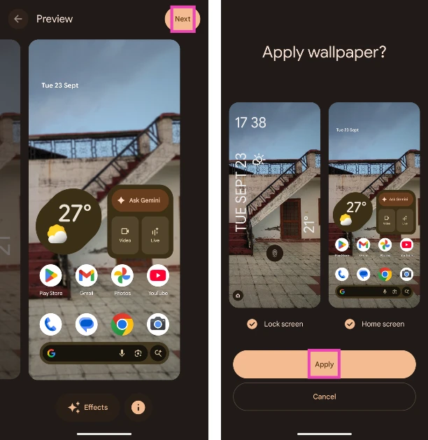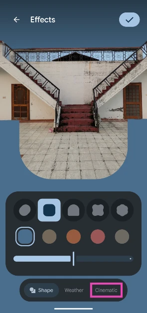 在您的 Google Pixel 上,轉至設置>壁紙>效果>天氣,選擇一種效果,然後點擊勾號圖標。