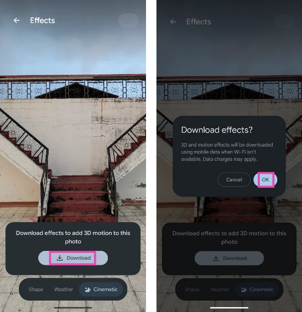 在您的 Google Pixel 上,轉至設置>壁紙>效果>影院,點擊“下載”,然後打開“向此照片添加 3D 動作”旁邊的切換開關。 '