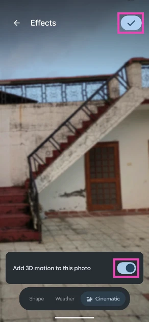 第5步:打開旁邊的切換開關為這張照片添加 3D 動作並點擊勾號圖標在屏幕的右上角。