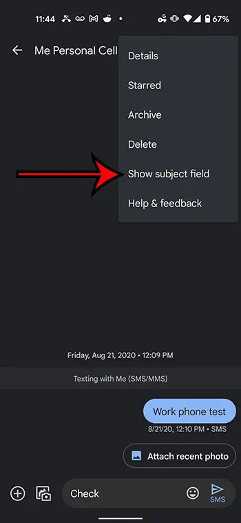 幸運的是,您可以通過在短信對話屏幕中打開菜單並選擇一個在屏幕底部顯示主題字段的選項,向 Google Pixel 4A 上的短信添加主題字段。