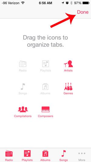 音樂應用程序底部最多可以有五個選項卡。因此,您需要將現有圖標替換為相冊圖標。我們將在下面的步驟中替換“藝術家”選項卡,但您可以替換您想要的任何選項卡。