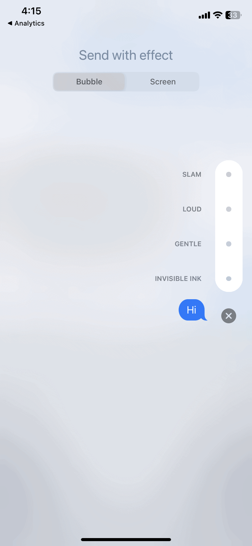 氣泡效果會改變消息氣泡本身的外觀。可以通過在輸入消息後按住發送按鈕(藍色箭頭)來應用它們。可用的氣泡效果包括: