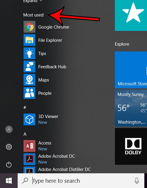 您可以為其中一些程序創建桌面快捷方式或在任務欄中添加按鈕,但您也可以在 Windows 10 中啟用一項設置,以便最常用的程序顯示在該菜單的特殊部分中。
