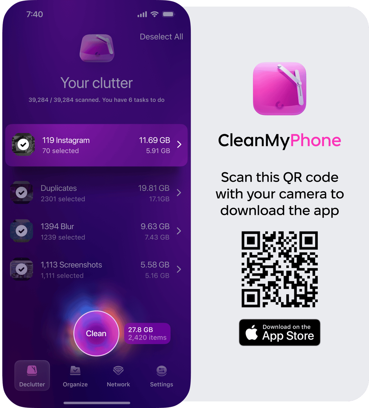 發布照片會很快耗盡 iPhone 上的存儲空間,因為 Instagram 會將照片保存在 iPhone 上。為了節省空間,請使用CleanMy®手機,它將檢測 Instagram 照片並幫助您清除副本,以便為新內容提供更多空間。