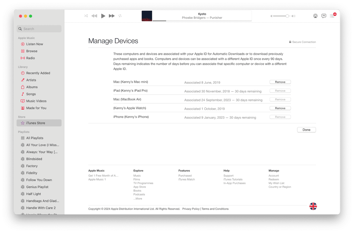 您將看到有權播放您 iTunes 帳戶中下載的音樂的所有設備的列表。您可以通過單擊“註銷”來取消對某些設備的授權。其他設備(在過去 90 天內獲得授權的設備)將收到一條消息,告訴您需要等待多少天才能取消授權。