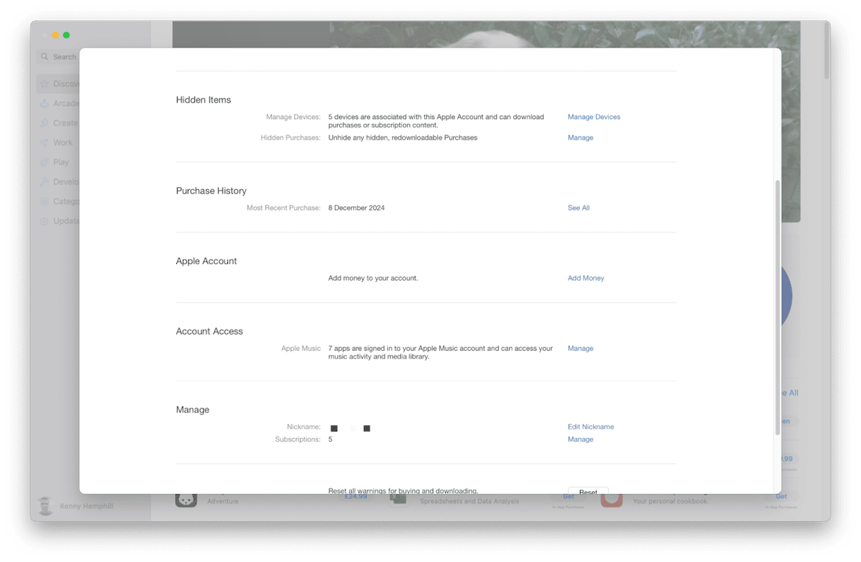 - 當 App Store 打開時,您將看到您的帳戶設置。向下滾動到隱藏項目,然後單擊管理設備。您將看到授權設備的列表。