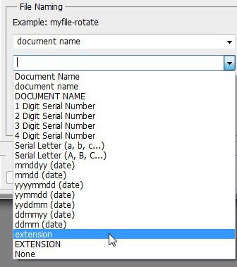 步驟 15:在現在顯示“文檔名稱”的字段右側的空白字段內單擊,然後鍵入要附加到新文件名的擴展名。例如,如果您要旋轉圖像,則可以在此字段中輸入“-rotate”。這將產生“myfile-rotated”的文件名。