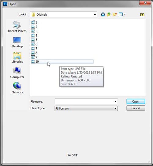 步驟 3:啟動 Photoshop,單擊“文件”,單擊“打開”,然後雙擊“Originals”文件夾中要編輯的文件之一。