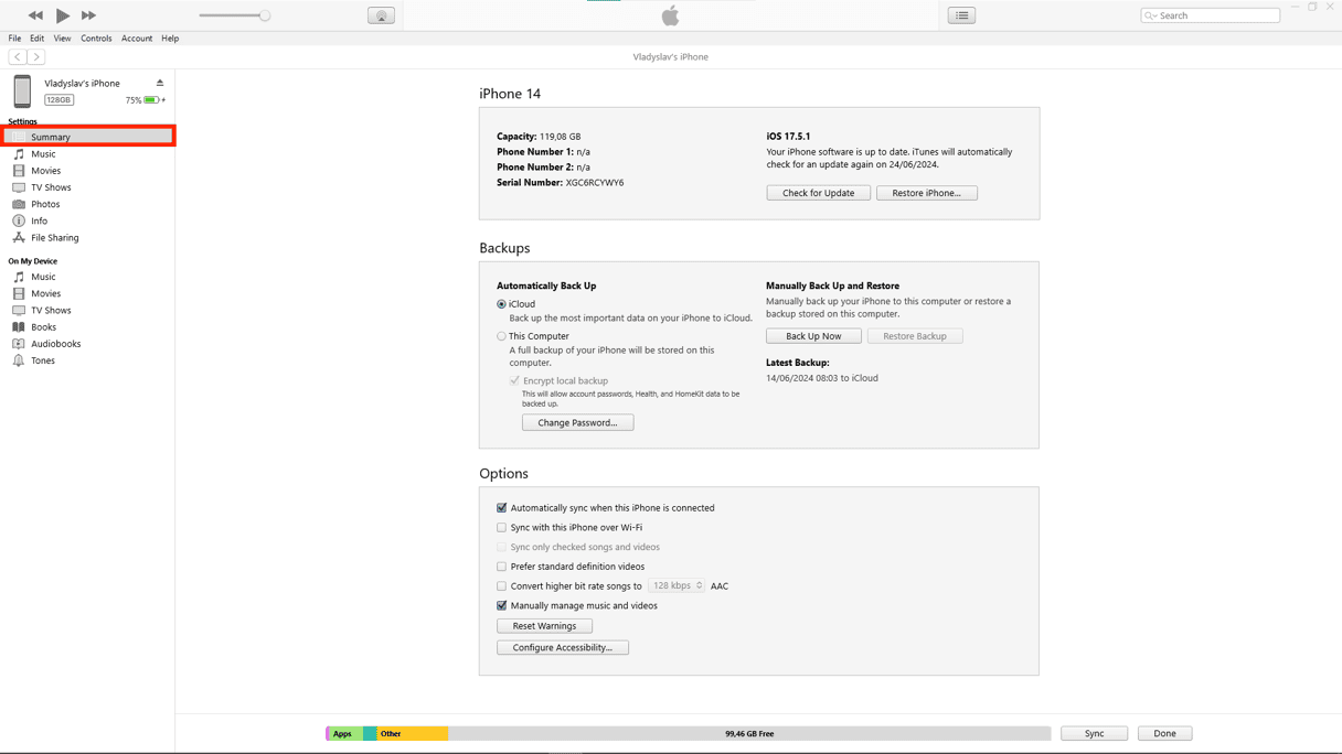- 單擊 iPhone 圖標可打開設備摘要頁面。
